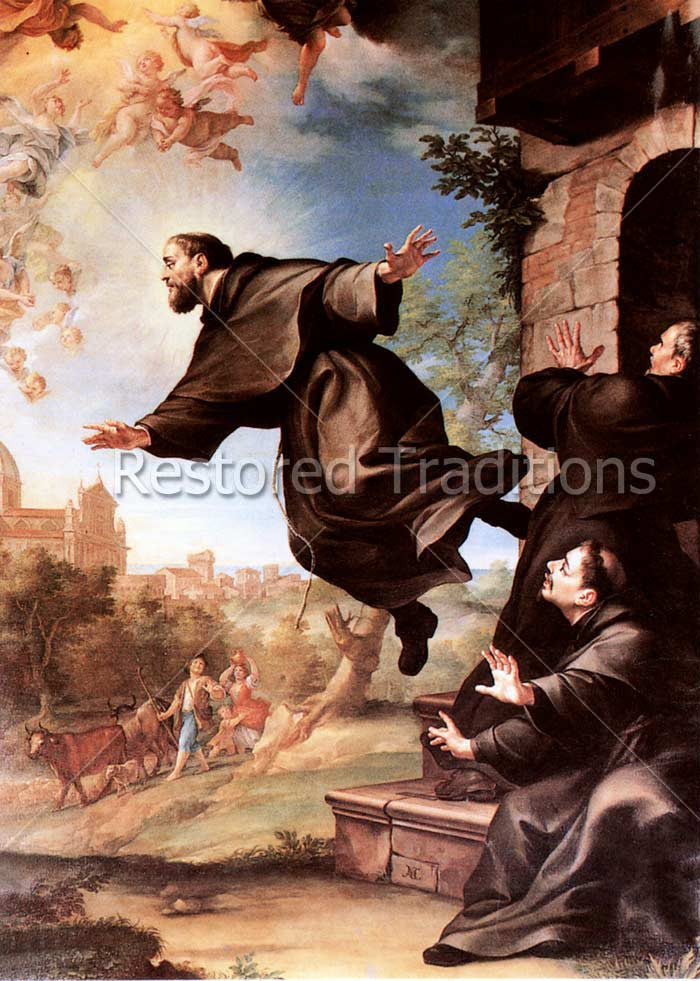 Saint Joseph Cupertino was a holy Franciscan priest in the seventeenth century. Known for levitating during prayer, he is the Patron Saint of Pilots. The full title of this painting  by L. Mazzanti  is: Saint Joseph Cupertino in Ecstasy of Seeing the Sanctuary of Loretto.