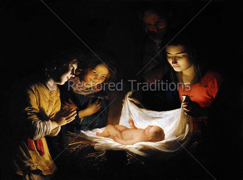 This Nativity artwork, by Honthorst, shows shepherds adoring the Christ Child after His birth in the stable. The Virgin Mary kneels on the right, while St. Joseph stands in the back. Two young shepherds kneel on the left. All gaze down, smiling, at the newborn Christ.