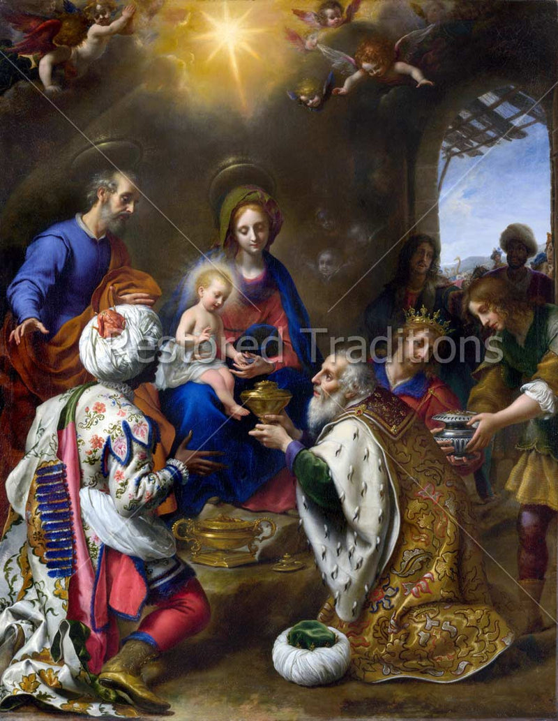 A single golden star and cherubs look down at the Three Kings kneeling before the Infant Jesus and His Mother, presenting their gifts in gold and silver boxes.