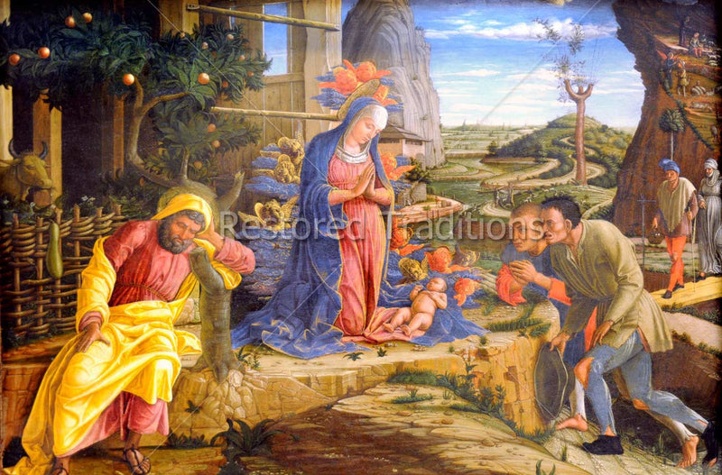 In this image A. Mantegna, the Blessed Virgin kneels over her Child outside a house, while shepherds come down a long winding path from the countryside to greet the Christ Child and His Mother. St. Joseph sleeps under a fruit tree in the foreground of the painting.