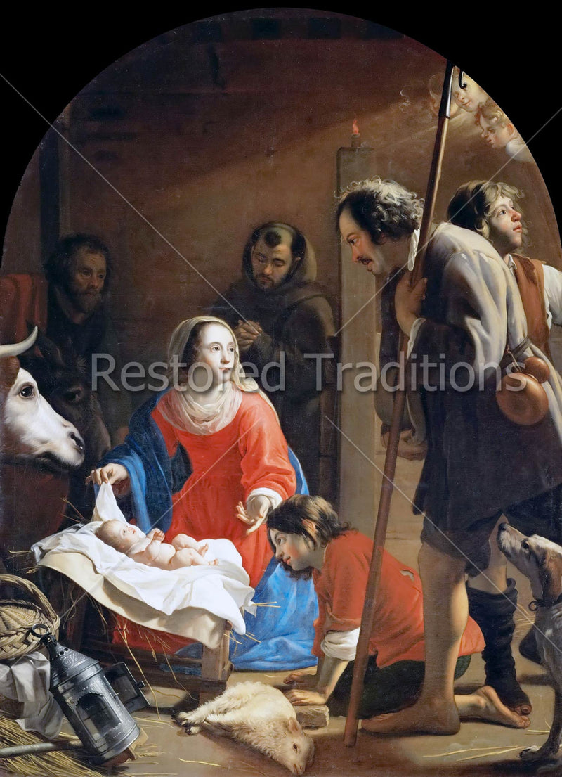This image, by artist Ost, shows the shepherds adoring the Child Jesus, with St. Francis of Assisi praying in the background. The Blessed Mother shows the Infant Christ to the shepherds.
