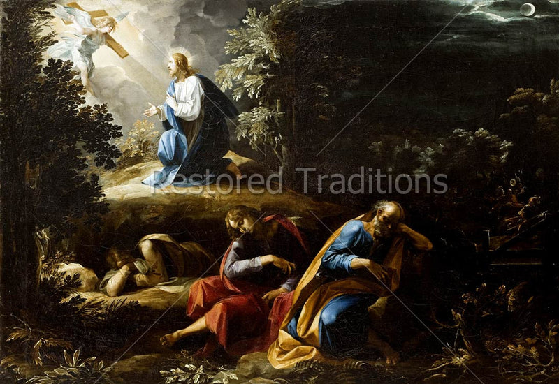 This picture, by Cesari, shows Christ suffering in the garden of Gethsemane right before His betrayal and arrest. Jesus prays in the background, looking towards a bright angel who bears a cross on his shoulder. The apostles, Peter, James, and John sleep in the foreground of the image.