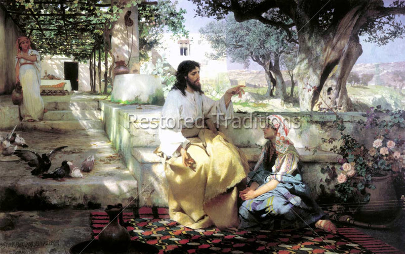 Jesus speaks with the contemplative Mary Magdalene while Martha does housework. Artwork by H. Siemiradzki