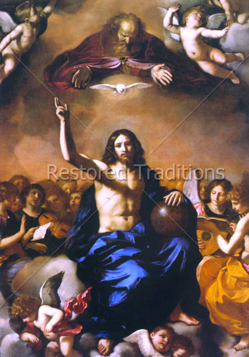 God the Father and God the Holy Ghost look down at God the Son, Who holds the globe and raises His right hand in teaching. Angels surround the Blessed Trinity. Artwork by Guercino