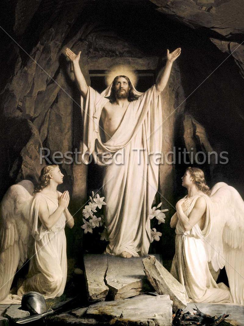 The glory of Easter Sunday is exquisitely captured in this artwork by C. Bloch. Two angels kneel in adoration on either side of the glorified Christ, Who stands on the cracked slab which covered the tomb's entrance. The iconic Easter lilies burst from the entrance of the tomb. Unlike other Carl Bloch paintings, this Resurrection painting is not brilliant in color. The artist has chosen instead to show the spiritual splendor of the moment.