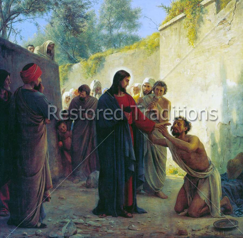 This artwork by C. Bloch depicts Christ healing the blind man, Bartimaeus, on the road to Jericho, by touching the man's eyes. A diverse crowd looks on, each spectator displaying a different reaction to the Savior's miracle.