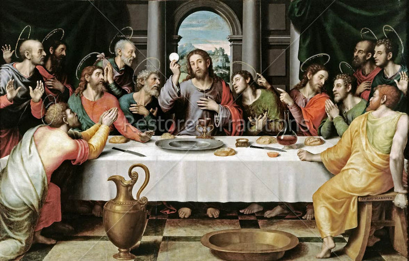 In this artwork by J. Juanes, Christ raises the bread He has consecrated to be His body during His Last Supper with His apostles.