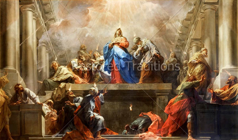 The Holy Ghost descends upon the Blessed Virgin Mary and the apostles in the forms of rushing wind and tongues of fire. Artwork by J. Restout.