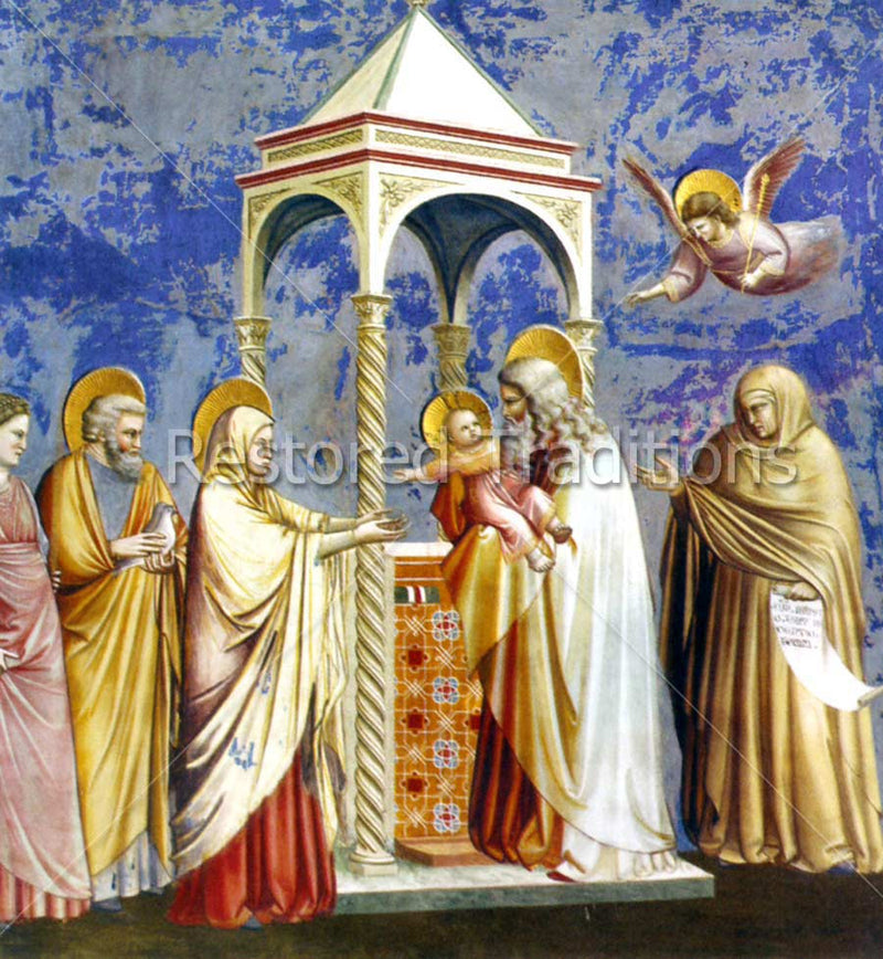 The prophet Simeon takes the Christ Child into his arms, prophesying the Savior's sufferings, while the Blessed Mother, Saint Joseph, the holy woman Anna, and others look on. Artwork by Giotto.