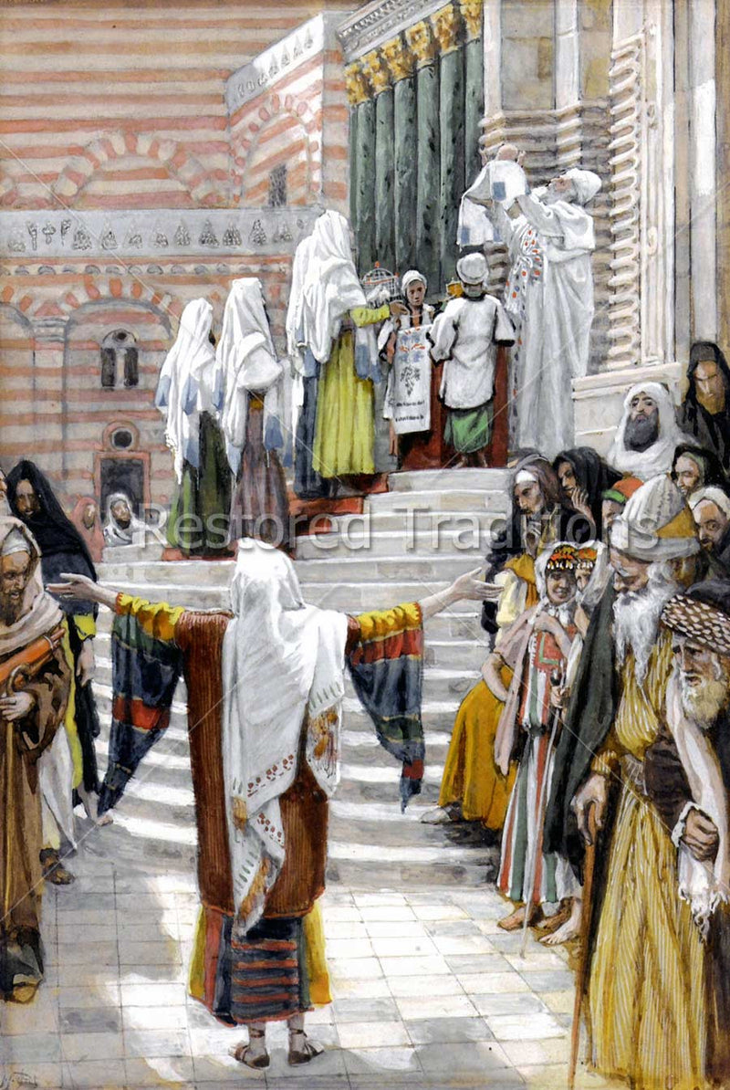 This artwork by Tissot shows the Virgin Mary and Saint Joseph presenting the Christ Child in the Temple. An aged and rejoicing Simeon holds the Baby Jesus high in his arms as the prophet recites his famous canticle. The holy woman Anna stands nearby, her arms outstretched in her recognition of the Savior.