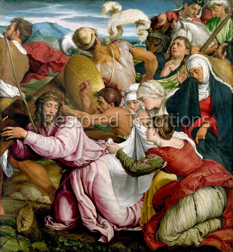 Jesus Christ falls under the weight of the Cross as Saint Veronica holds up her veil to wipe His holy face. The mourning Virgin Mary stands on the right of the image with the other holy women. Artwork by J. Bassano.
