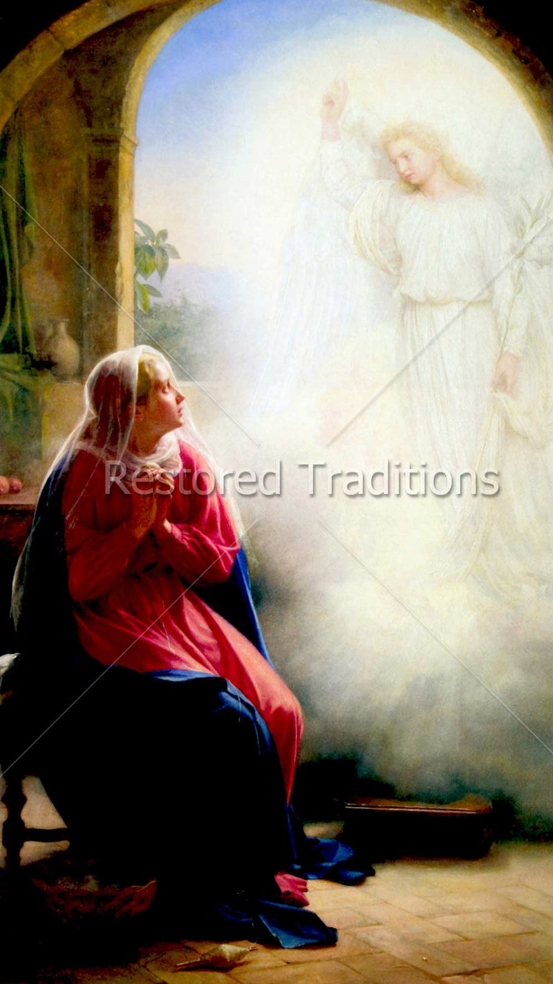 The Archangel Gabriel asks the Blessed Virgin Mary to be the Mother of God as he stands in the doorway behind her in the midst of a white cloud. Artwork by C. Bloch