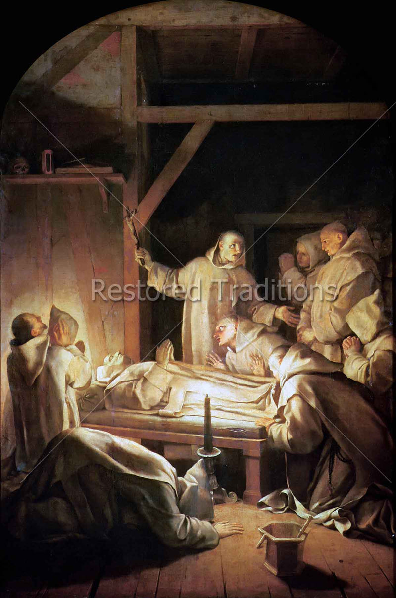 This artwork, by E. Le Sueur, depicts the death of St. Bruno, founder of the Carthusian Order. The saint's body sheds heavenly light on the reverent brothers gathered around it.