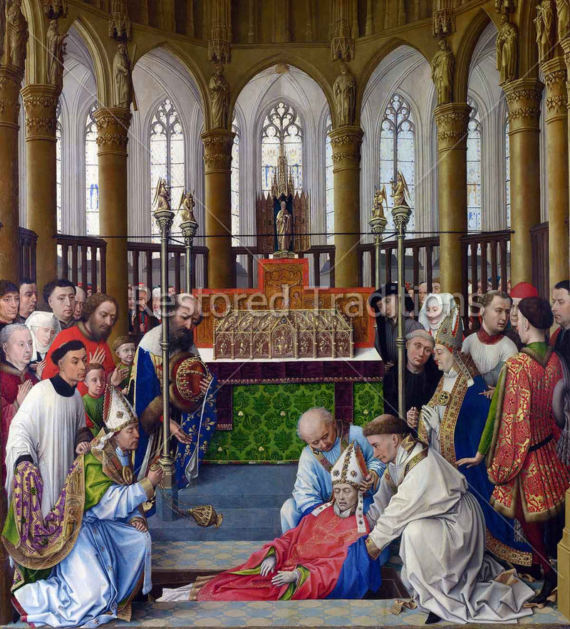 In the ninth century, Saint Hubert's body was exhumed and found to be uncorrupted, in Saint Peter's at Liège. This convinced the Church of Hubert's sanctity. This image is a companion artwork to the Dream of Pope Sergius. Both paintings were formerly part of the same altarpiece, by R. Van der Weyden.