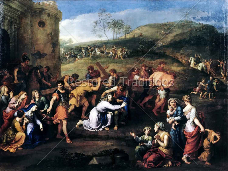 Soldiers force Jesus along the Way of the Cross outside of Jerusalem as women and children, held back by the soldiers, pitifully look on. Artwork by Mignard