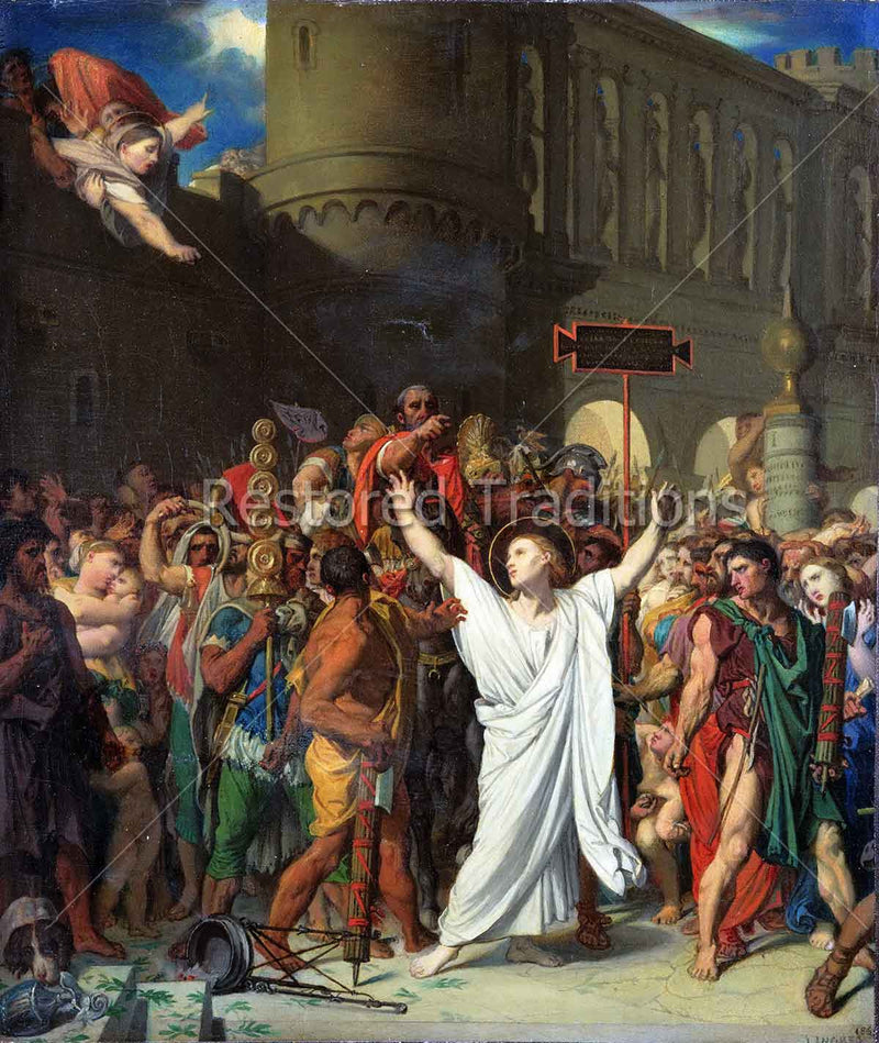 This painting shows the early Christian martyr from Gaul, Symphorian, being led to death by beating while his mother, Blessed Augusta, calls out to him: "Son, son, o Symphorian, remember your God!". Artwork by J. Ingres.