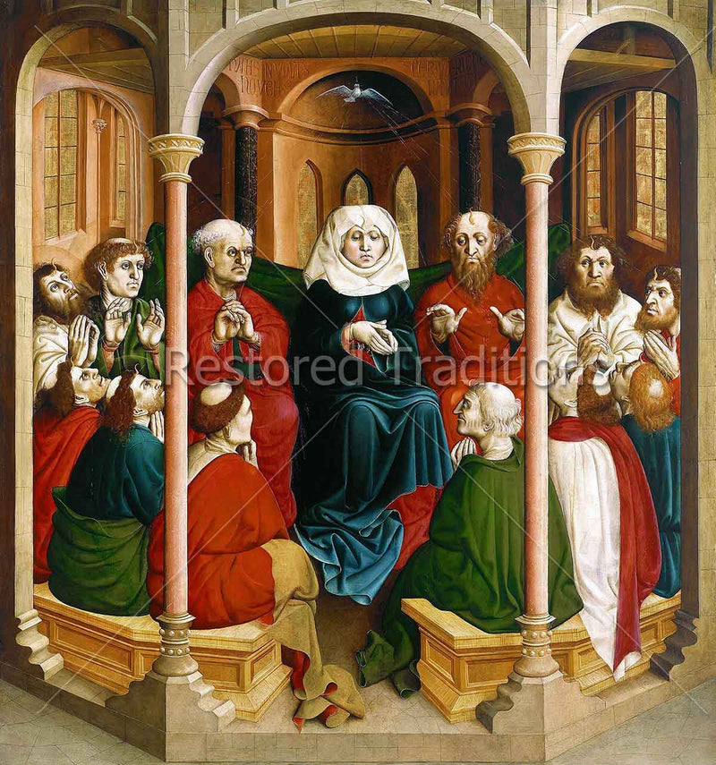 The Blessed Virgin Mary and the apostles receive the inspiration of the Holy Spirit in the form of tongues of fire above their heads. Artwork by H. Multscher.