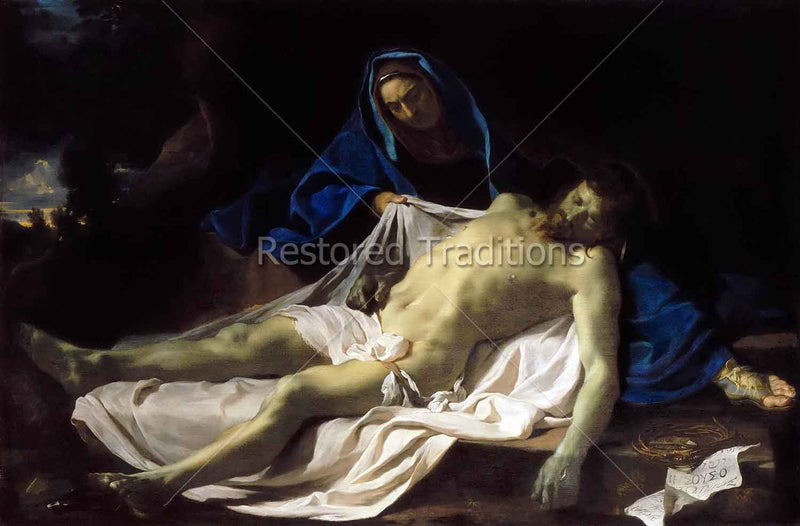 The Blessed Mother sorrowfully lays out the body of her dead Son before burial. Artwork by Le Brun.