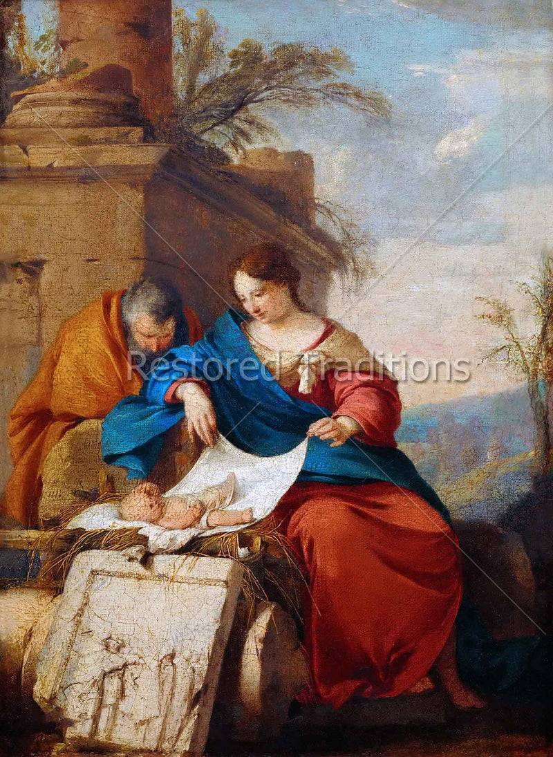 The Blessed Virgin Mary and St. Joseph rest among ruins during their journey to Egypt. Our Lady places the Infant Jesus on a cloth atop a ruined pillar. Joseph and Mary lovingly look down at the Savior. Artwork by L. Hyre