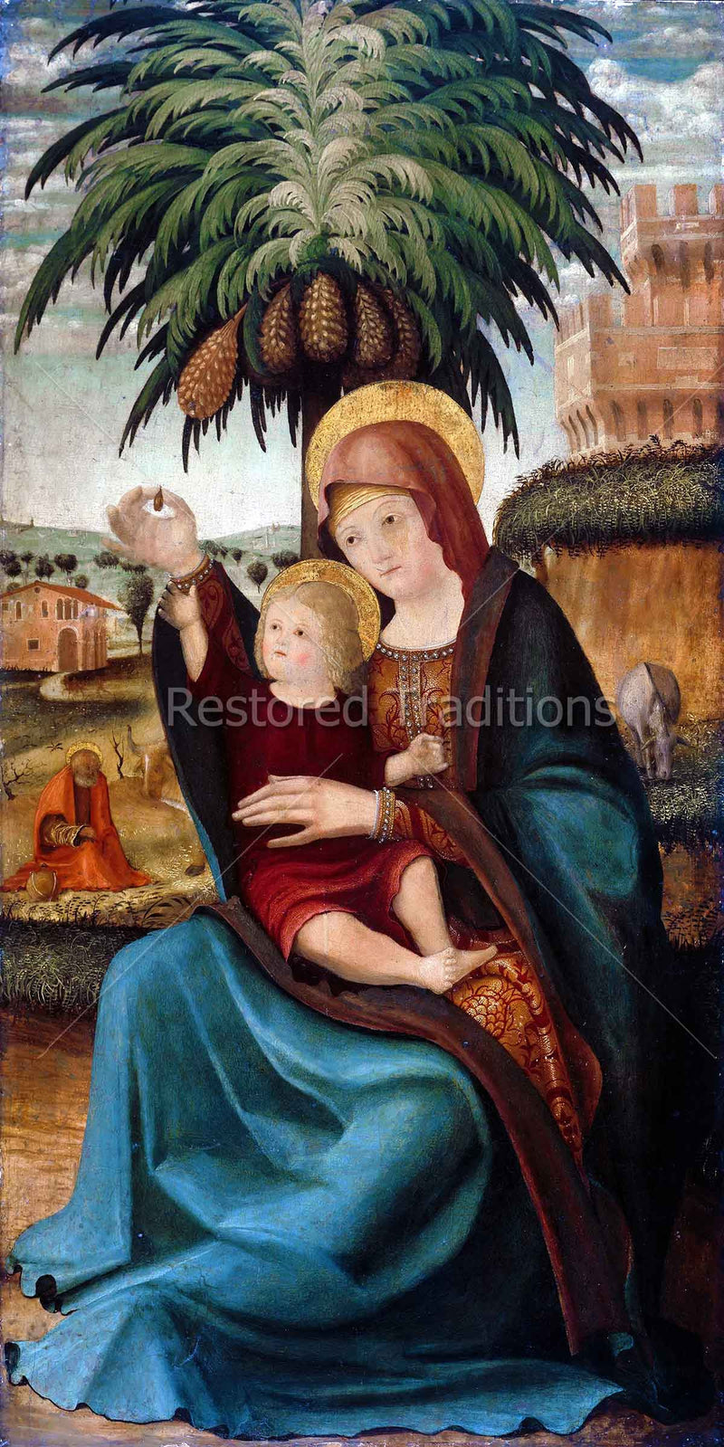 The Blessed Mother sits holding the Infant Jesus under a palm tree as the Holy Family takes some respite during the flight from Bethlehem to Egypt. Artwork by the sixteenth-century Venetian School.