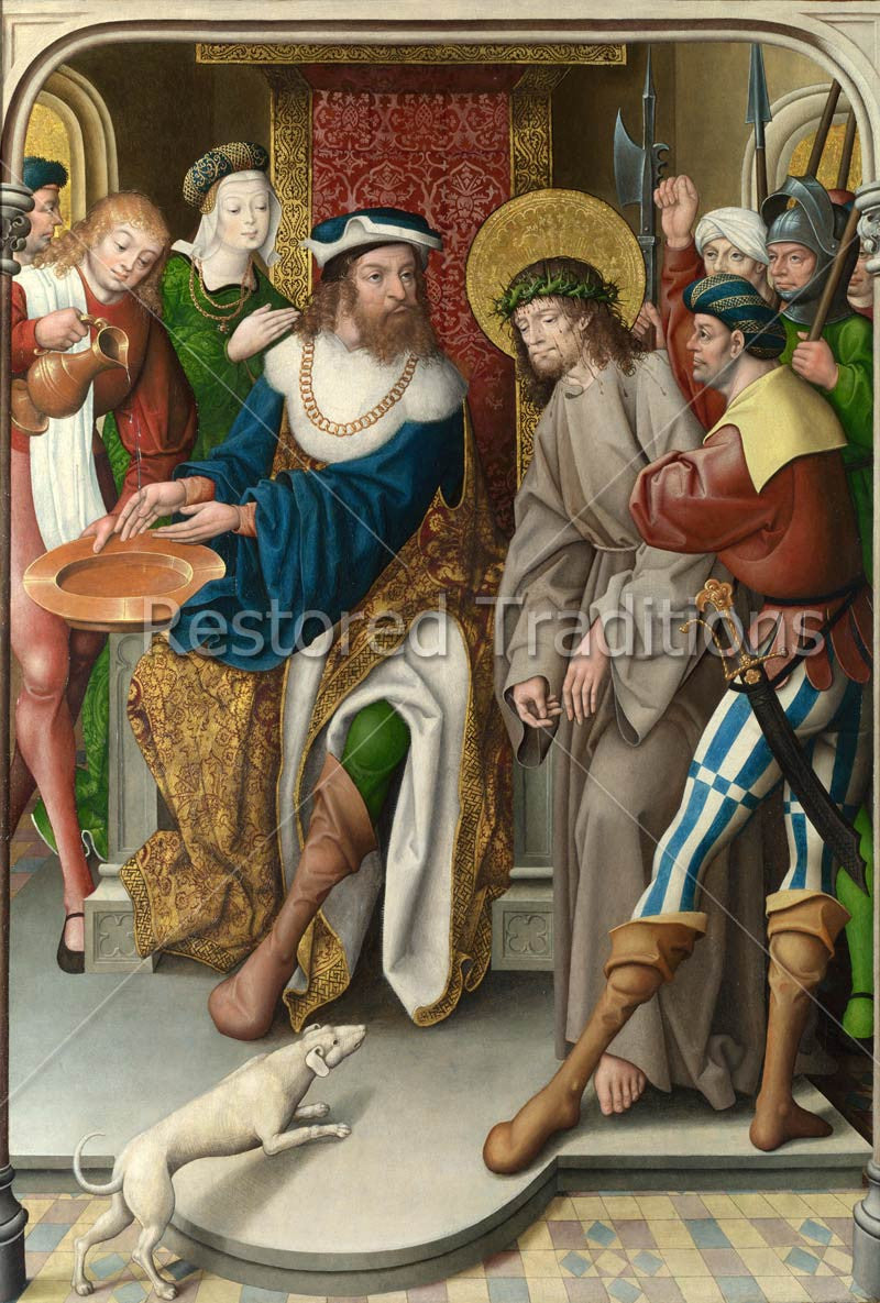 Jesus is condemned to death, in this Renaissance artwork by the Master of Cappenberg. Pontius Pilate washes his hands and claims he is innocent of the blood of Christ.
