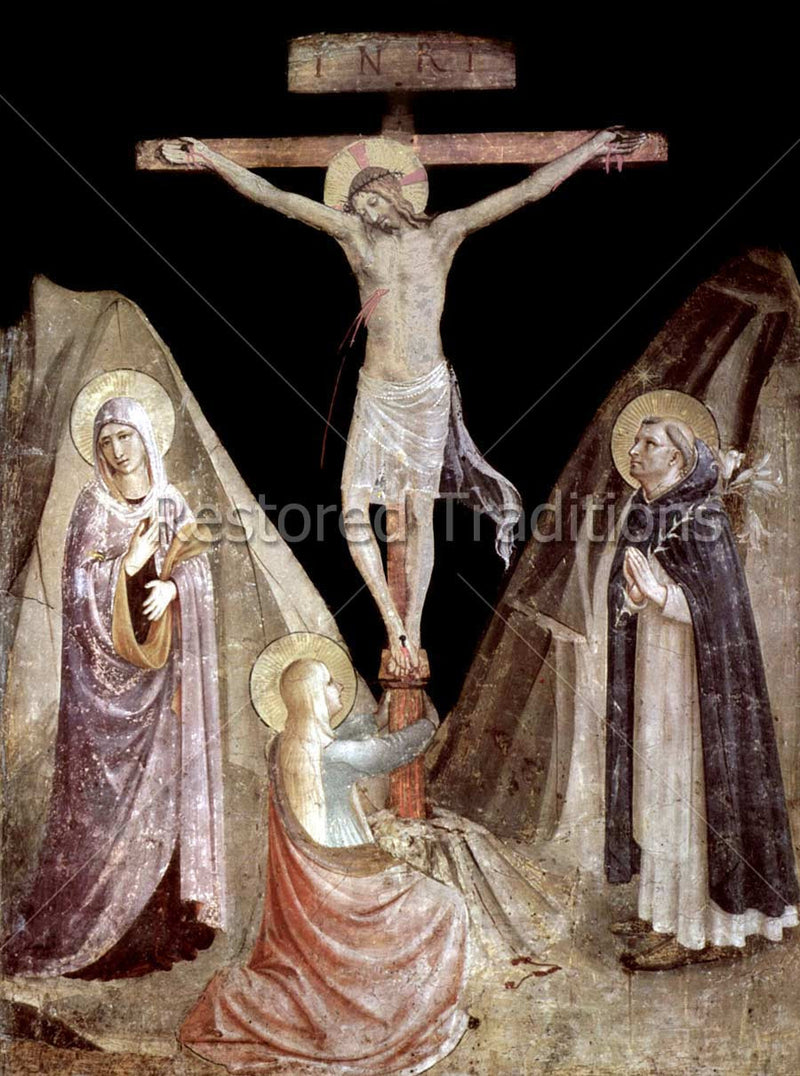The last drops of Precious Blood issue from Christ's side during the final moments of the Crucifixion on Golgotha. The Virgin Mary, Mary Magdalene, and St. Dominic are present at the foot of the Cross. Artwork by Fra Angelico