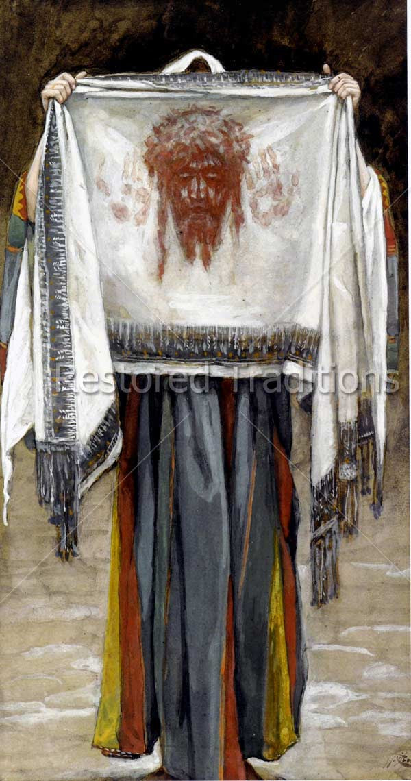 Saint Veronica holds up the veil, which she used to wipe the Face of Jesus Christ as the Savior carried His Cross to Mount Calvary. An image of Christ's Face is imprinted on the veil with blood. Artwork by Tissot