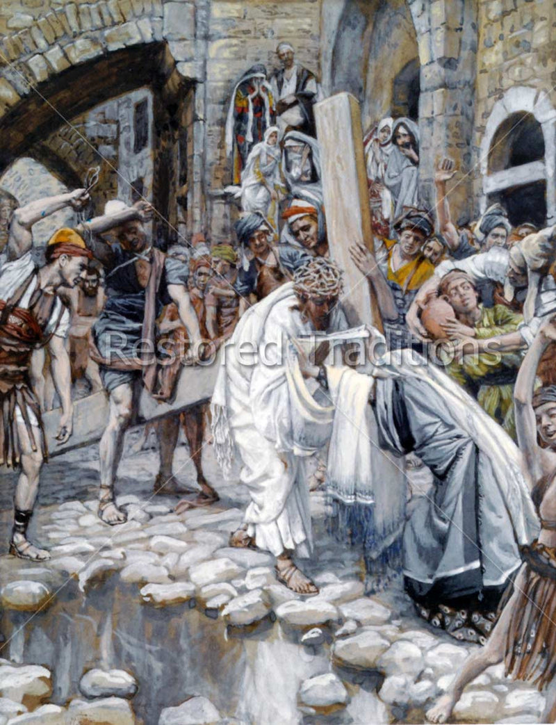 Saint Veronica uses her veil to wipe the blood off the face of Christ as the Savior carries His Cross to Mount Calvary. Artwork by James Tissot