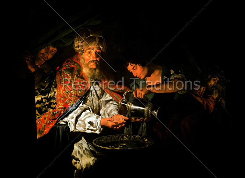 Pontius Pilate washes his hands, claiming to be innocent of the blood of Christ, Whom he sentences to death. The darkness surrounding Pilate can be viewed as symbolic of the Roman governor's sin. Pilate's face looks heavy as light shines on it. Artwork by by M. Stom.