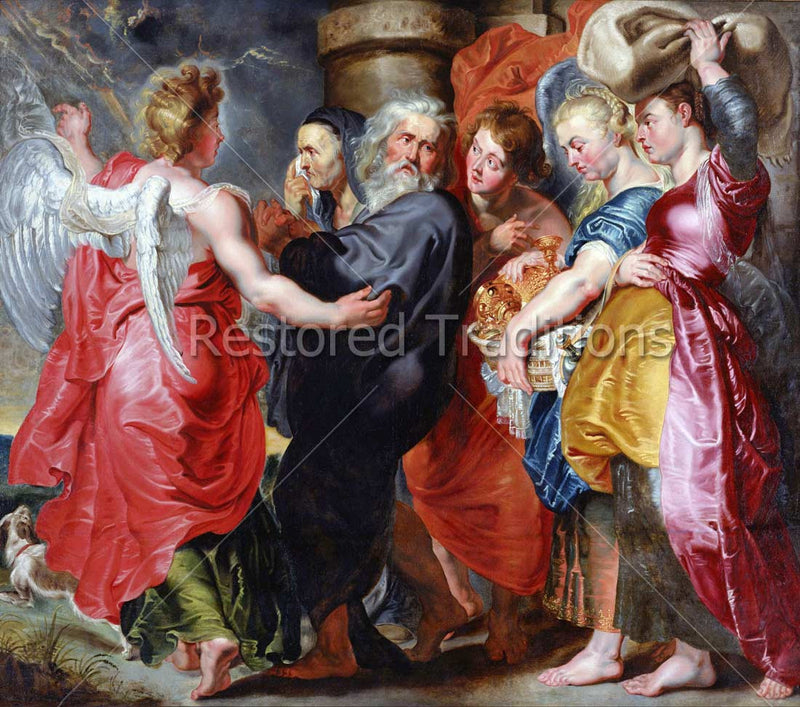 Lot and his family flee from Sodom, at the instruction of an angel, who tells the family not to look back at the city being destroyed by fire. Artwork by J. Jordaens.