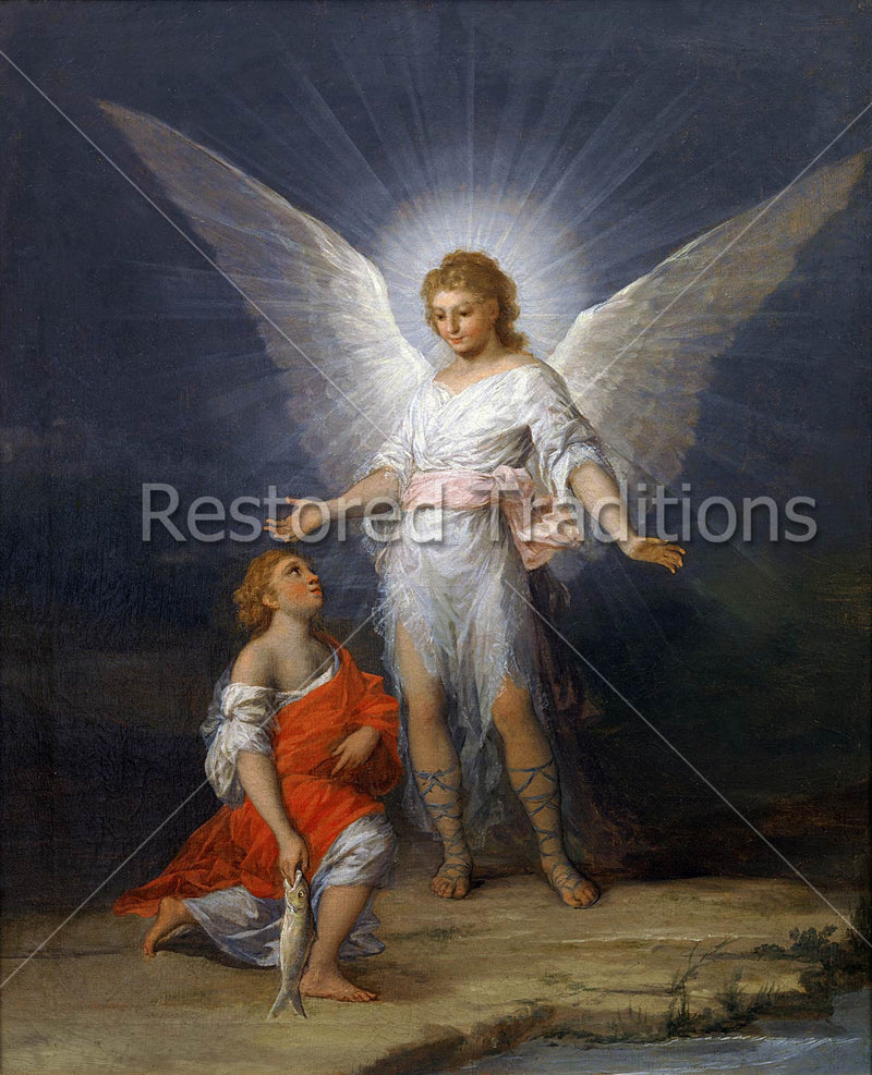 God sent the Archangel Raphael to aid and guide the young Tobias in finding a cure for Tobit's blindness. This image of Tobias holding the fish for Tobit's eyes while being mesmerized by the shining glory of the Archangel is by the artist F.
