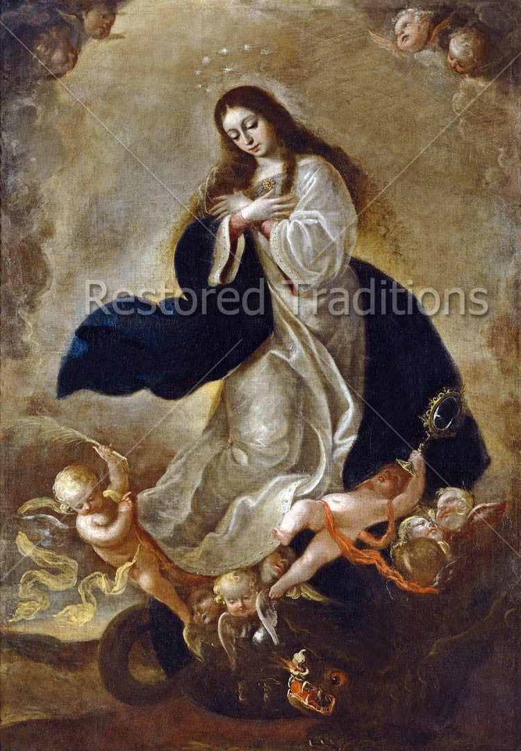 This seventeenth-century artwork depicts the Blessed Mother, as the Immaculate Conception, wearing a white dress, symbolizing her virginity, and a blue cloak, symbolizing her maternity, and crowned with stars. The Virgin crushes a serpent, representing the devil. A crescent moon is also at her feet. Cherubs surround Mary in the clouds, one of them holding up a mirror to reflect her beauty.