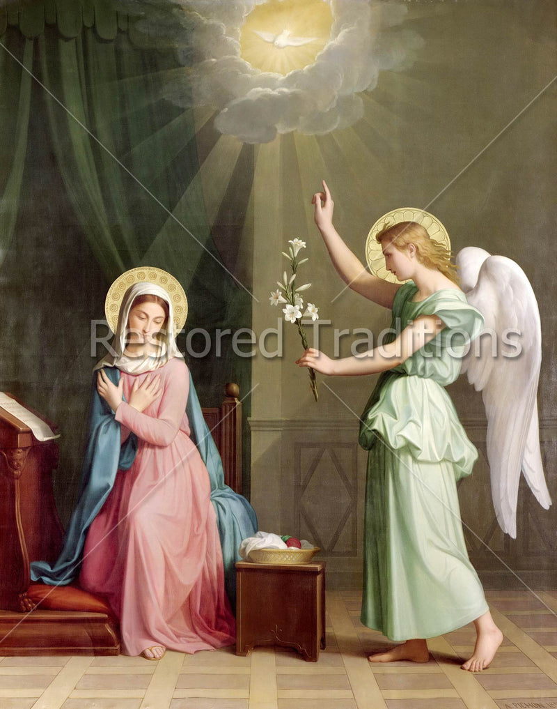 This image by the artist Pichon shows the Archangel Gabriel visiting the Virgin Mary to ask her to be the Mother of God. She agrees, and the power of the Holy Ghost comes down to her as rays of light while the God-man, Jesus Christ, takes flesh in her womb.