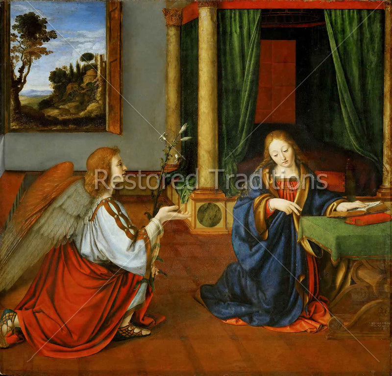 The Angel Gabriel, holding a stalk of lilies, kneels before the Blessed Virgin as she prays in her bedroom, and asks her to be the Mother of God. Mary responds with her Fiat: "Be it done unto me according to thy will."