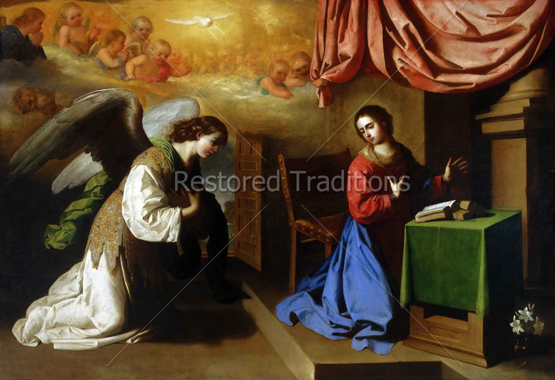 St. Gabriel the archangel appears to the Blessed Virgin Mary and asks her to be the mother of the Redeemer. She accepts with her Fiat: "Be it done unto me according to thy word." Cherubs, sitting in bright clouds, watch Mary make her decisive reply as the Holy Ghost descends on her from Heaven.