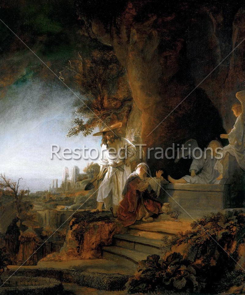 After Jesus rose from the dead, He appeared to Mary Magdalene. This image, by Rembrandt, shows the Risen Christ, dressed as a gardener and holding a shovel, speaking with an astonished Magdalene, while angels sit on and around the opened tomb.