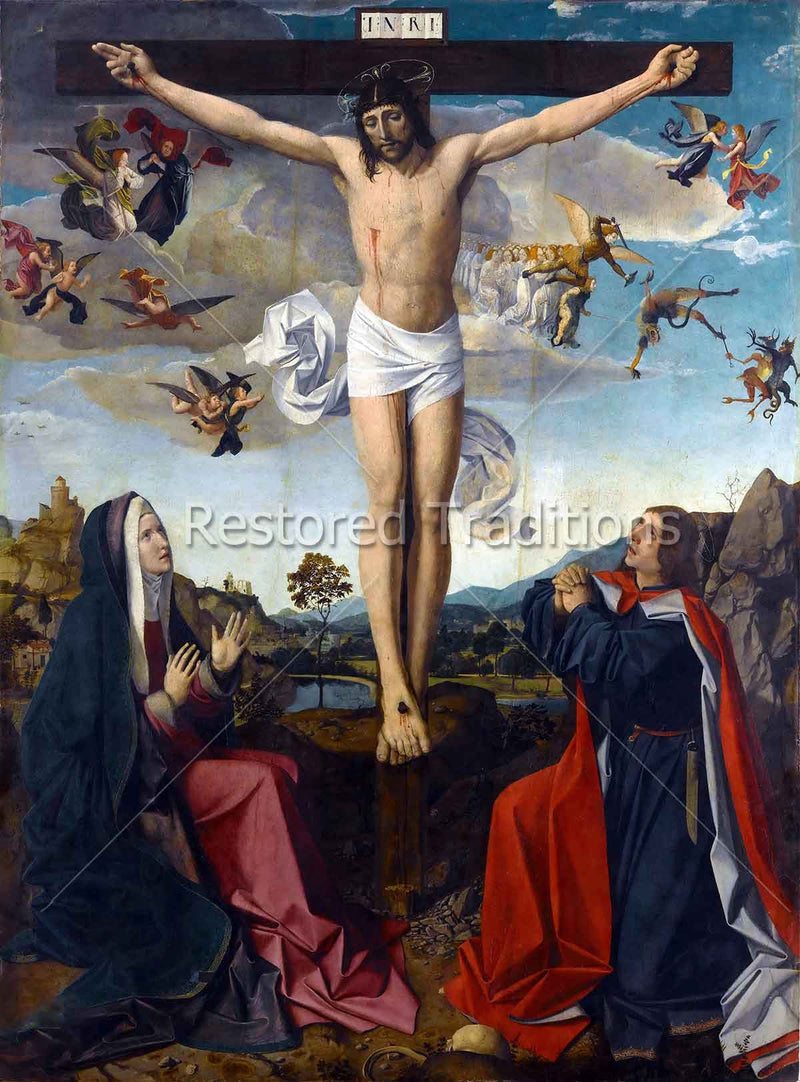 Christ hangs on the cross for three hours on Good Friday as His mother, the Blessed Virgin Mary, and his beloved apostle, St. John, remain with Him to the end. In the background, angels adore the Savior or fight the devils. Artwork by
