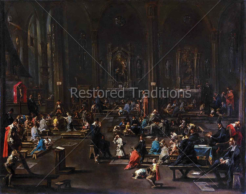 People and priests are seated at various tables, which are scattered throughout the large Cathedral, learning the word of God, in this artwork by A. Magnasco.