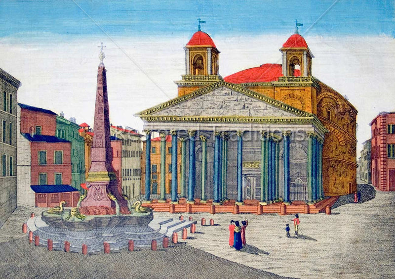 An antique illustration, by artist Carmine, of the Basilica of Saint Mary of Angels and Martyrs, in Rome, which was built on the ruins of the Emperor Diocletian's Baths by Pope Pius IV, and where that Pope is buried.