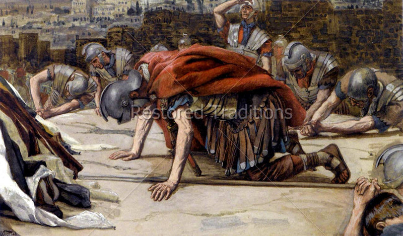 This artwork by Tissot shows the Roman centurion Longinus kneeling, with his face bowed to the ground and his lance cast down, adoring the Crucified Christ and professing his faith in the divinity of the Savior. "And the centurion who stood over against him, seeing that crying out in this manner he had given up the ghost, said: 'Indeed this man was the son of God.' " — Mark 15:39