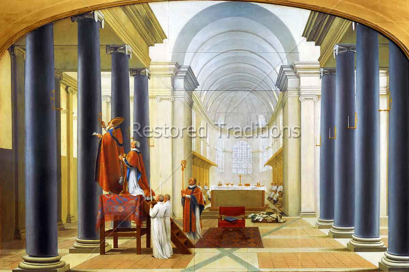 A bishop consecrates a church belonging to the Carthusian Order, the monastic order instituted by St. Bruno. Artwork by E.