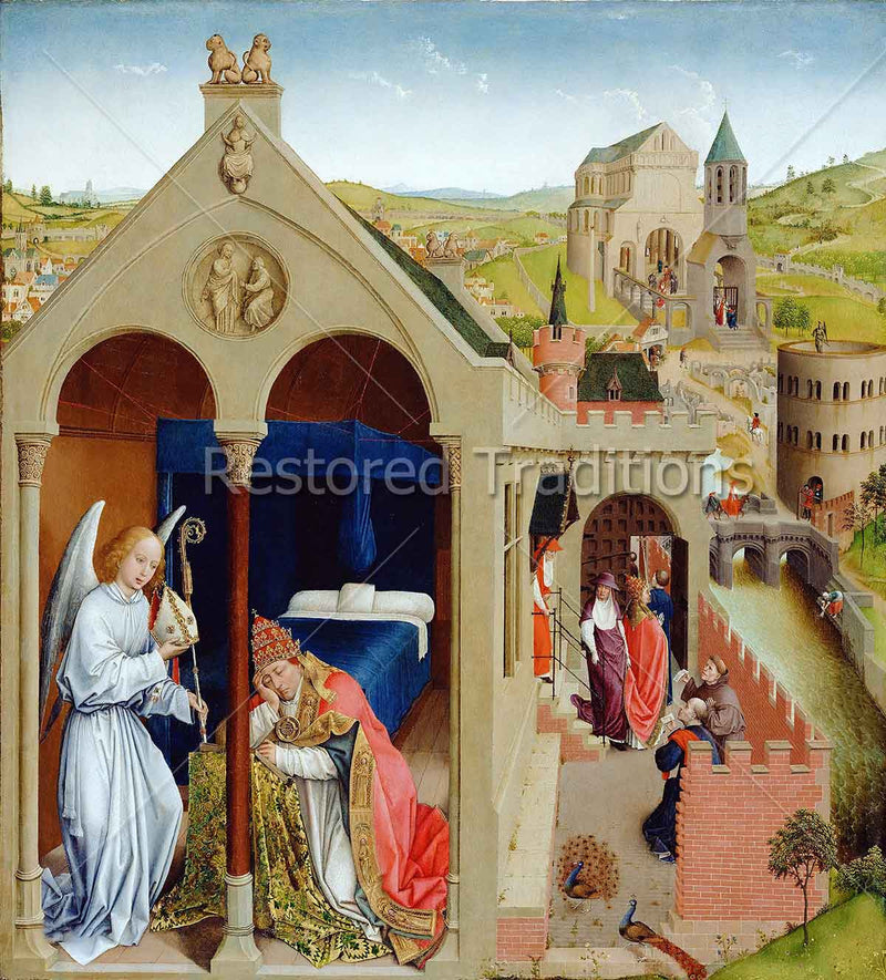 An angel appears to Pope Sergius in his sleep and tells him that Saint Lambert has been killed, and that the Pope must appoint Saint Hubert as bishop. This is a companion artwork to the Exhumation of St. Hubert. Both panels were part of one former altarpiece in the Chapel of Saint Hubert in Brussels, made by R. Van der Weyden.