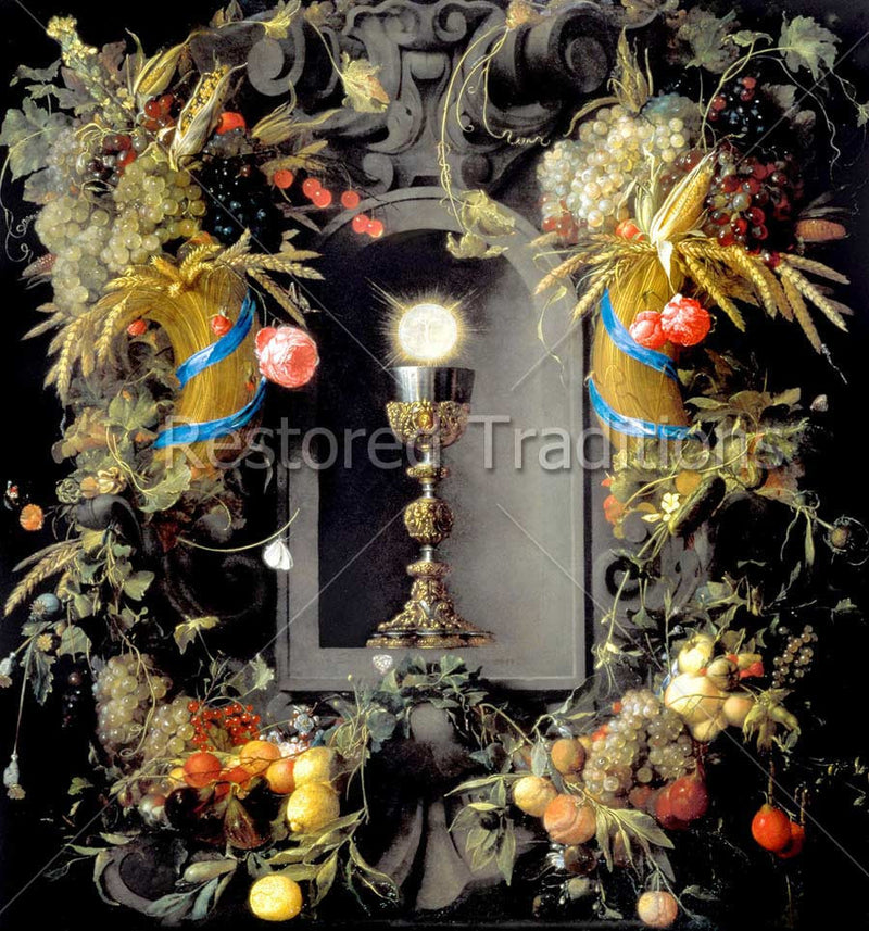 made this artwork depicting a resplendent consecrated host, surrounded by flowers and fruit.