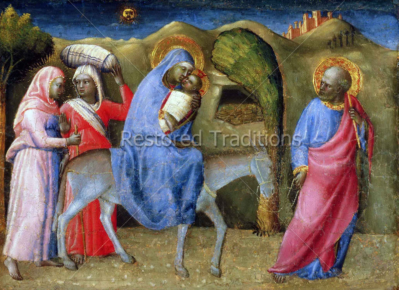 Our Lady holds her newborn Baby Jesus close in her arms as Saint Joseph leads her on a donkey