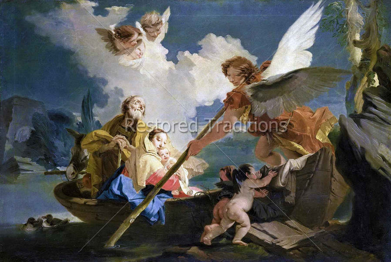 Angels guide the Holy Family away from Bethlehem and the sword of Herod and into Egypt and their hidden life. Artwork by G. B.