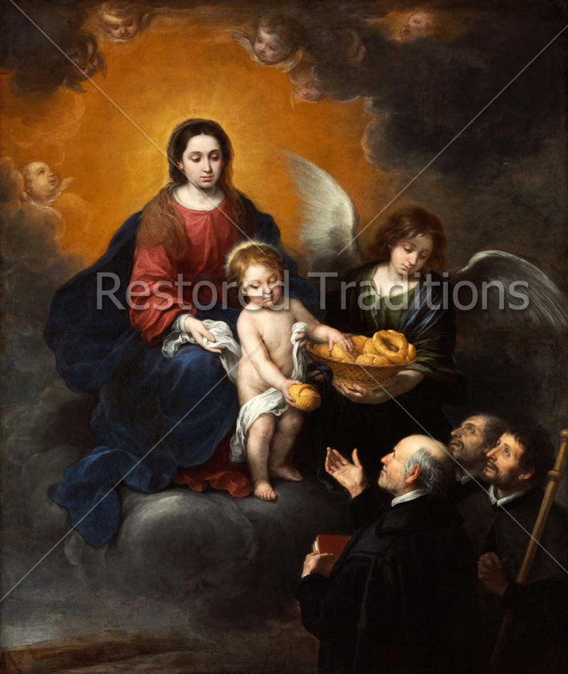 In this painting by E. Murillo, the Infant Jesus sits on the knee of the Blessed Virgin and distributes heavenly bread to pilgrims with the assistance of an angel. Cherubs look down at the scene of heavenly charity.