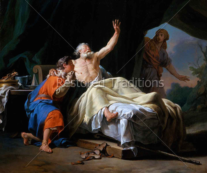 The dying Isaac, touching the animal fur around Jacob's neck, imparts his blessing which was meant for Jacob's brother Esau. Artwork by N. G. Brenet.
