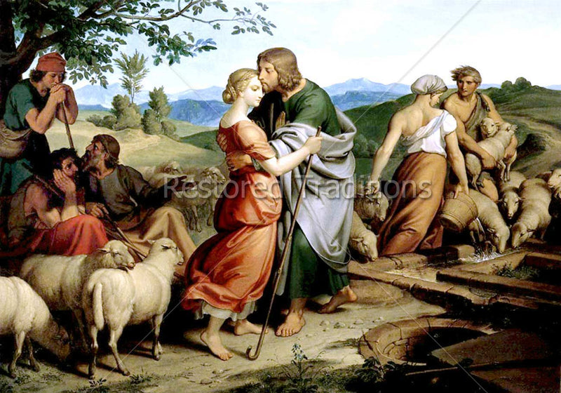 Jacob, while staying with his uncle Laban, falls in love with Laban's daughter, Rachel, as she waters her father's flock of sheep. Artwork by J. Fuhrich.
