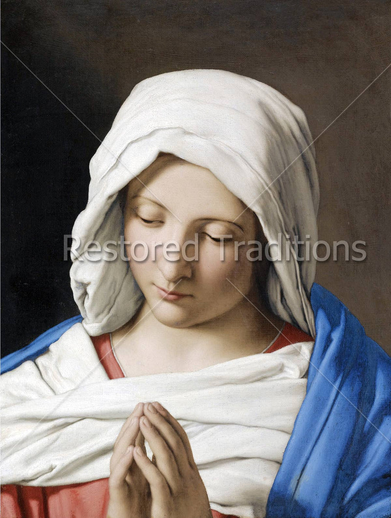 This image of Our Lady by Sassoferrato shows the Blessed Virgin Mary praying with folded hands.