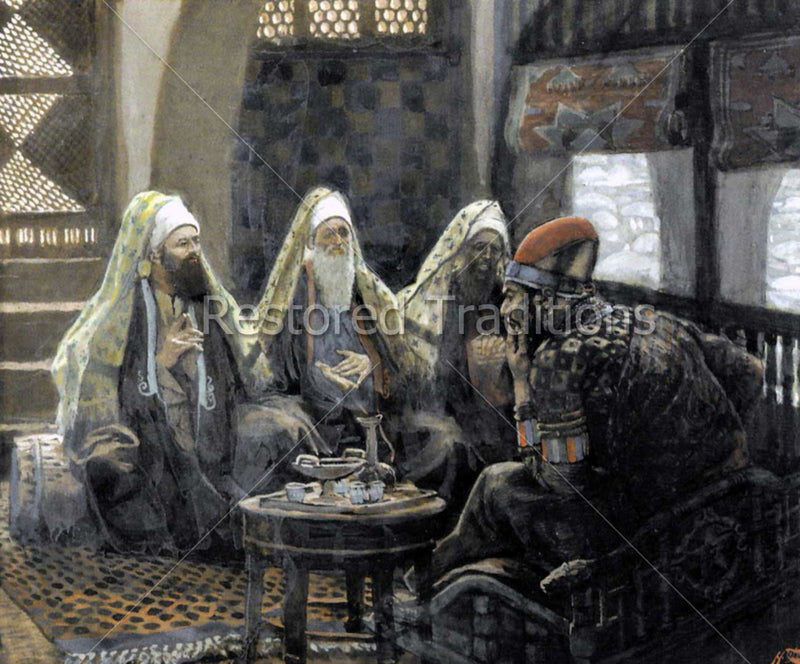 This artwork by Tissot shows King Herod speaking with the Three Kings, who are seeking the Christ Child. The meeting is recounted in Matthew 2:7-8.